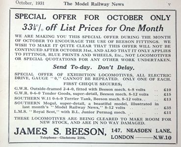Illustration B2o. Thanks are due to Jonathan Lewis for alerting me to this advertisement, and for locating another Beeson one shown below about Special Offers that appeared in the same journal issue. (See The Model Railway News, October 1931, 7, 82, page v.)
